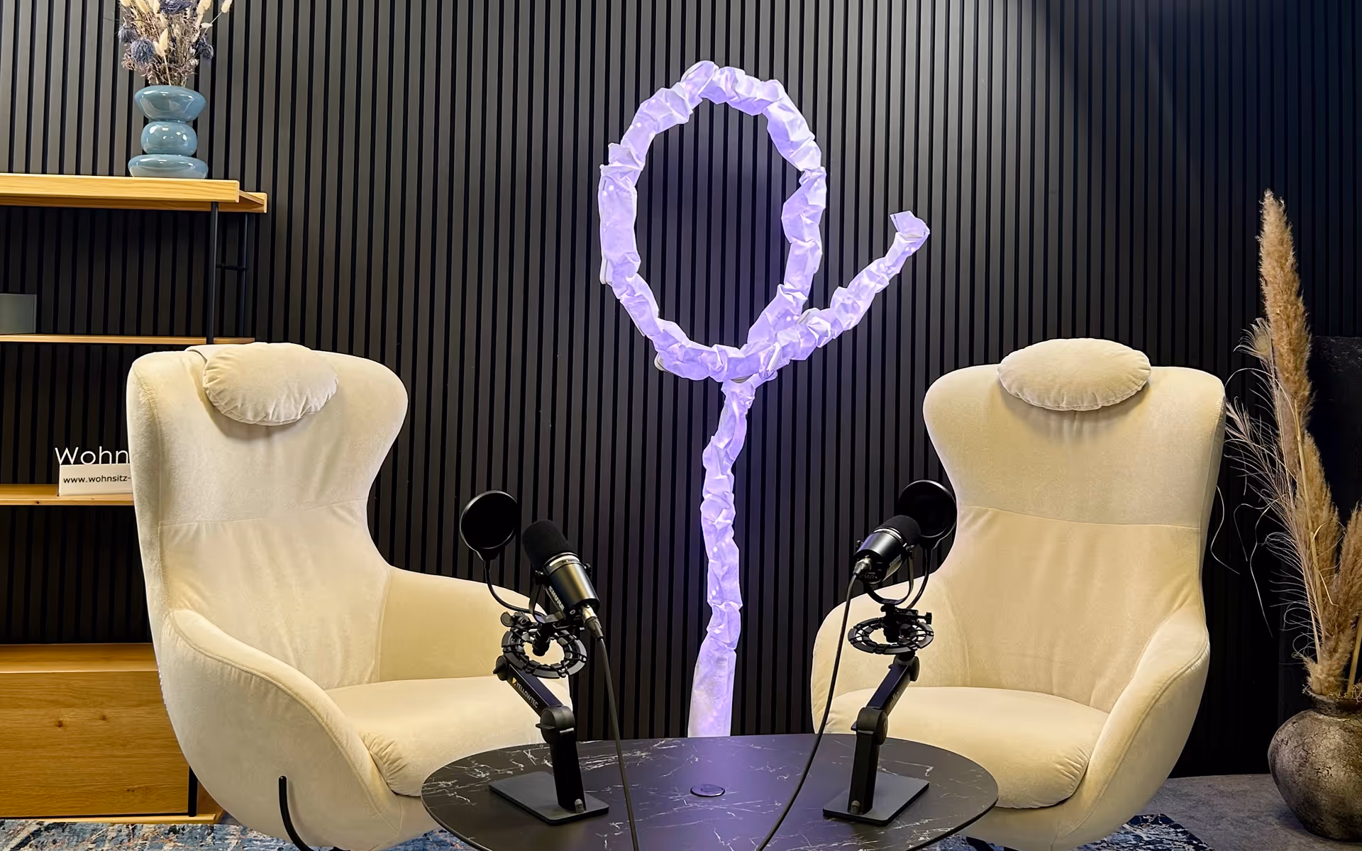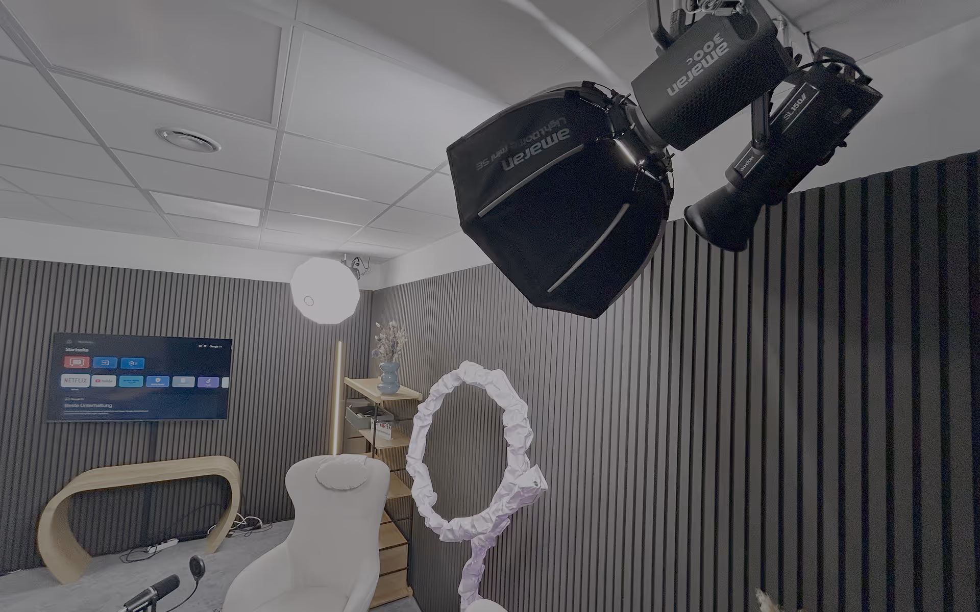 Lichtelemente können per App in Deinem Branding leuchten und Du kannst das Studio nach Deinem Belieben dekorieren, solange Du nichts an die Wand bohren musst. 😉
