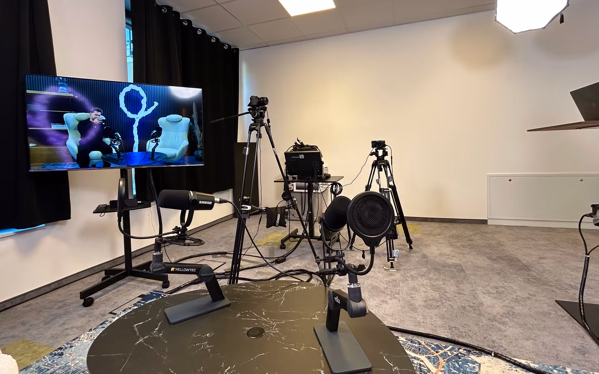 In unserem Studio ist Platz für bis zu vier Personen, die gleichzeitig an der Aufnahme beteiligt sind. Miete unser hochmodernes Studio für Deinen Video-Podcast und Dein Webinar.